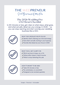 If your wedding business felt busy, heavy, or reactive last year — this is where you reset. The 2026 Wedding Pro CEO Reset Checklist is a short, practical tool designed to help you step out of survival mode and back into CEO mode.